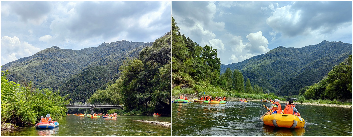此次行程兩天一夜,在導(dǎo)游的帶領(lǐng)之下,我們首先來到石臺縣大演鄉(xiāng)剡溪村的西黃山漂流景區(qū)。下榻之時(shí),正值正午時(shí)分,景點(diǎn)兩岸青山疊嶂、風(fēng)光旖旎、草木蔥蘢、景色怡人。協(xié)普家人們換好服裝,穿上救生衣,在工作人員的協(xié)助之下,或一家?guī)卓?、或三五好友結(jié)伴乘筏而行、泛舟漂流,水面波光瀲滟、河底各式各樣的鵝卵石靜靜地躺著,日復(fù)一日被溪水沖刷,變得光滑又圓潤,坐在游筏里俯身去看,“瞧,有不少小魚正悠閑地在它的身上游過呢”,其水之清澈由此可見一斑。此次漂流全程3公里,在漂流過程中,除了欣賞到秀美的湖光山色,體驗(yàn)到劈波斬浪的沖刺暢快感,更讓人愜意的是,在河灘淺水區(qū)域漂流回緩,協(xié)普家人們正帶著孩子們,在這悠閑的時(shí)光里愉快的打起了水仗,孩子們帶上了自己心愛的水槍玩起了水槍大戰(zhàn),有人帶來了水盆和水瓢,于是乎水槍大戰(zhàn)現(xiàn)場演變成了潑水節(jié),歡笑聲、尖叫聲蕩漾在山谷之間,在這愜意的時(shí)光里,平日的壓力和煩擾仿佛已煙消云散。