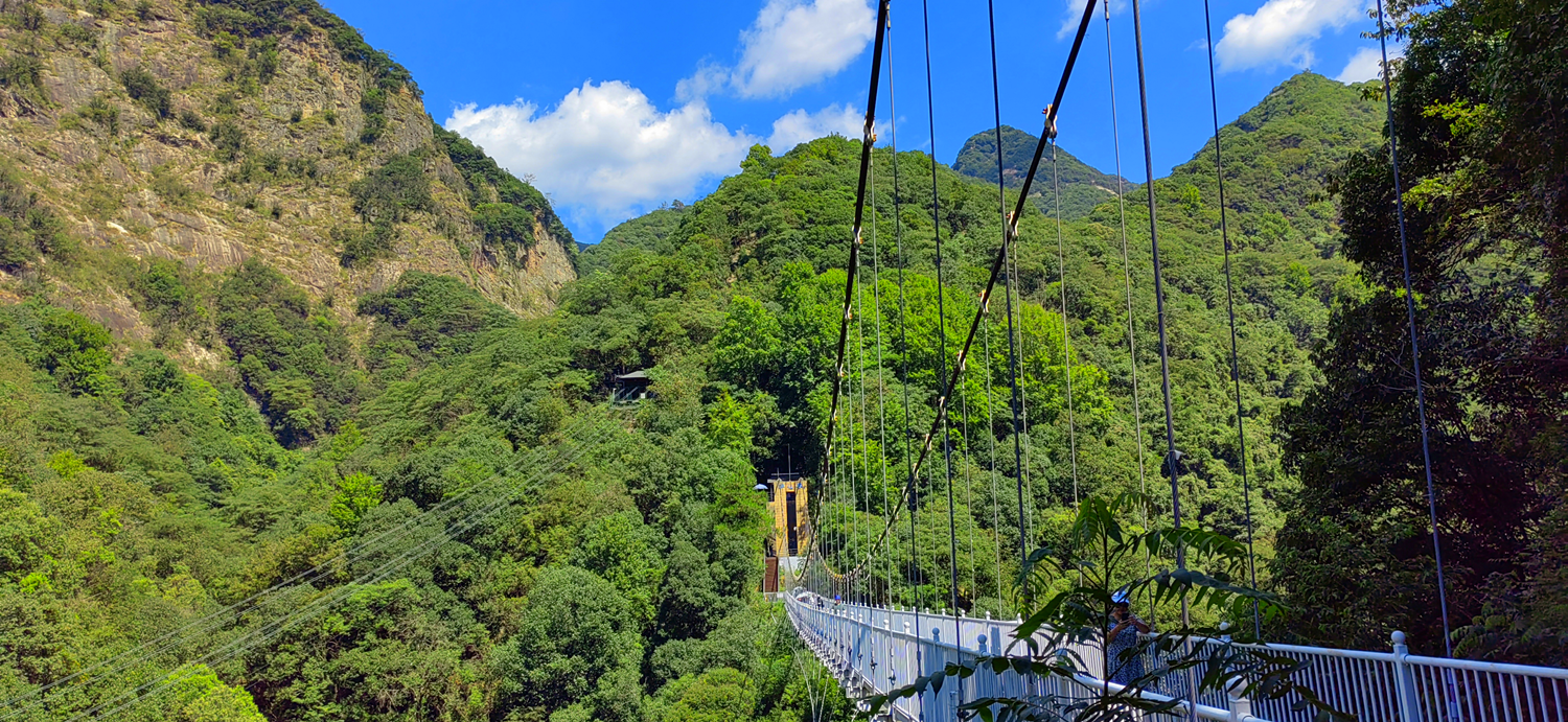 晚上體驗(yàn)了農(nóng)家樂菜肴和當(dāng)?shù)靥厣袼藓螅诙煸缭绲钠鸫?,吃完早餐集合,大家興致勃勃地乘著大巴來到了醉山野景區(qū),這里是安徽省內(nèi)第一個(gè)5D玻璃橋皖南地區(qū)最大的瀑布群。在進(jìn)入景區(qū)之前,有一段鄉(xiāng)村道路,徒步的過程頂著早上八九點(diǎn)的太陽就覺得酷暑難耐,然而當(dāng)我們正式踏入景點(diǎn),走在山谷間的步棧道上,遠(yuǎn)處是蔥郁的山林、近處是流動(dòng)的溪水、頂上是一片陰涼,只聽見大朋友們小朋友們都在說“好涼快啊,好涼快??!”沿著步棧道繼續(xù)前行,來到了千花橋,這里是著名的網(wǎng)紅打卡點(diǎn),小朋友們都絡(luò)繹不絕的脫下鞋子、挽起褲腳,下水嬉戲游玩。有合影拍照的、有撿起小石片仍水花的、還有在石頭縫里抓螃蟹的。大家坐在陰涼的石頭塊上休憩閑聊,甚至玩笑起來,富硒山水、天然氧吧,以后老了退隱山林一定要來這里休養(yǎng)生息。有人不被沿途風(fēng)景耽誤過久,繼續(xù)往山上攀爬,他們到了山頂穿過了玻璃棧橋,體驗(yàn)了“一覽眾山小”的視野和格局。由于兩個(gè)月沒有下雨,雖有山谷溪流卻看不到震撼的黃崖瀑布群,實(shí)屬遺憾,卻也給大家下次再來此一游留下了機(jī)會(huì)。